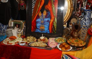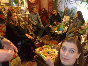 We really went too far with the food, as most of my Russian friends contributed dishes. We had steamed baby potatos with cream and herring, piroshki, caviar blinii, “herring in a fur coat” which is the pinkish boat-shaped dish above, a delicious herring and beet concoction, my own top-secret world-famous cured salmon on cream cheese and bread (this salmon is the only food I know how to prepare besides spaghetti and cereal, and I think it is enough), deviled eggs, two different Georgian garlic-aubergine dishes, potatoes Olivier (this is some sort of Russian potato salad and I still don’t know its connection to Laurence Olivier), shredded sweet carrot salad, homemade buttermilk cheese (the other thing I forgot I know how to make) which we spread on crackers with kim chee, a Russian super-garlicky cheese which we spread on anything we could find, and a Dianda’s rum cake the size of Utah. Our friend Robert brought homemade Kahlua and there was lots and lots of vodka.