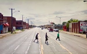 Roofs face the elements without shingles and collapsing, store fronts stand shuttered and windows boarded over, and gingerbread crumbles off formerly elegant facades. In Doug Rickard’s “A New American Picture” on view at Stephen Wirtz Gallery, the sense of desertion pervading the images remains strangely untempered by the spotty presence of people. They amble past decrepit houses and drive on cracked, untended roads. It’s hard to imagine the buses they wait for will arrive. They seem more like trespassers on long-abandoned property than residents of Detroit, Memphis, Fresno and Houston.