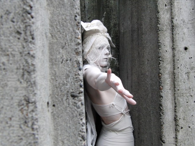 As a prelude to Bad Unkl Sista’s latest production, “First Breath, Last Breath,” the performers proceeded into the lobby—slowly, staring at the audience, making gong noises on obscure instruments—before moving into the proscenium theater space. The procession gave the audience something the performance could not. Up close we could see the magnificently bizarre costumes devised by artistic director, choreographer, and soloist Anastazia Louise. It was a head-scratching amalgam of Victoriana, Burning Man, and Steampunk: gas masks, fishbowl mouthpieces, hoop skirts of shredded denim, toreador and Japanese hakama pants, Puritan bonnets, and of course the signature white full-body paint of Butoh.