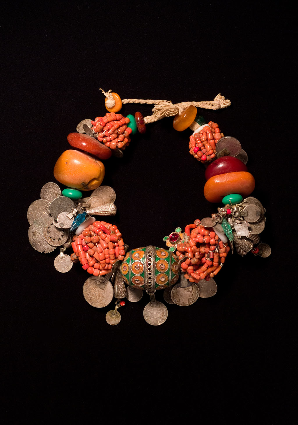 Necklace with central pendant (tagguemout) – Draa Valley, Morocco. 20th century. Silver, copper, coral, enamel, coins, glass, copal, shell, cotton, plastic, buttons