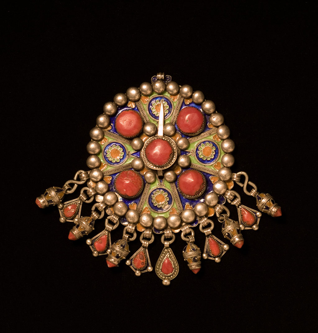 Fibula (tabzimt). Aït Yenni peoples, Great Kabylie, Algeria. Late 19th century. Silver, coral, enamel