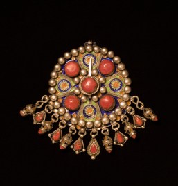 The other, flashier section of the ‘Desert Jewels” exhibit features actual jewels. Much of it is Amazigh jewelry, referring to the original inhabitants of North Africa, from the area known as Maghreb, the Arabic word for the West (the crossroads of the Middle East, sub-Saharan Africa, and Europe). Amassed by the man whose name represents the sort of jewelry and accessories you buy when you want to show the world you have lots of money and no stylistic courage, it is interesting that his personal tastes run towards these rugged, hand-hewn, tribal objects. All of them are “big” compared to the kind of jewelry we wear, and none of them were worn alone. North Africa never got Chanel’s memo about taking one thing off before you leave the house. The amount of jewelry the average western woman would dare to wear and still worry was “too much” fell off an impoverished Tunisian girl every time she sneezed. Head ornaments, fibulae, bracelets, necklaces, belts, amulets, all carried symbolic meaning, as well as aesthetic value.
